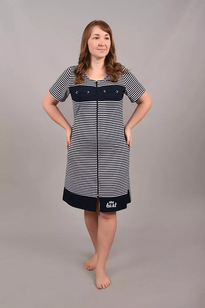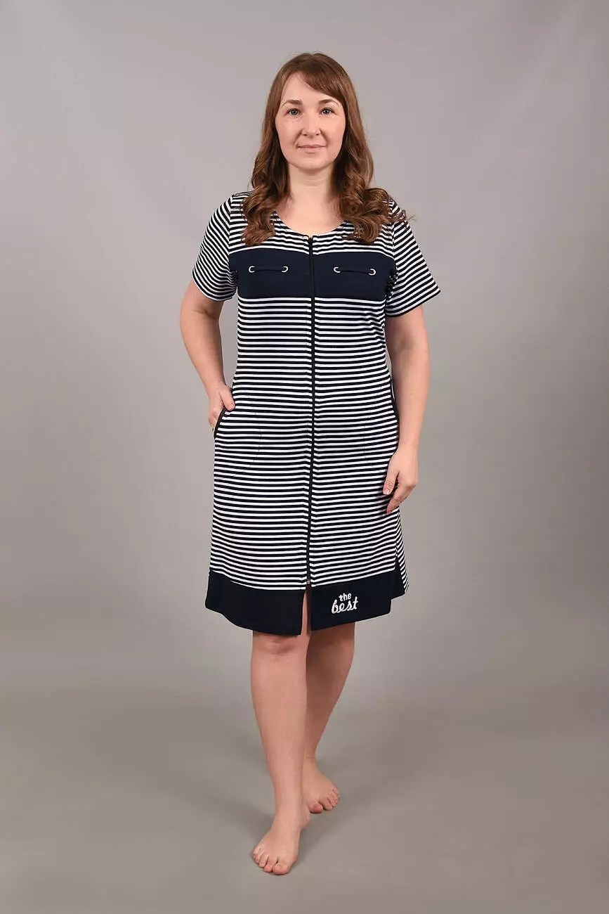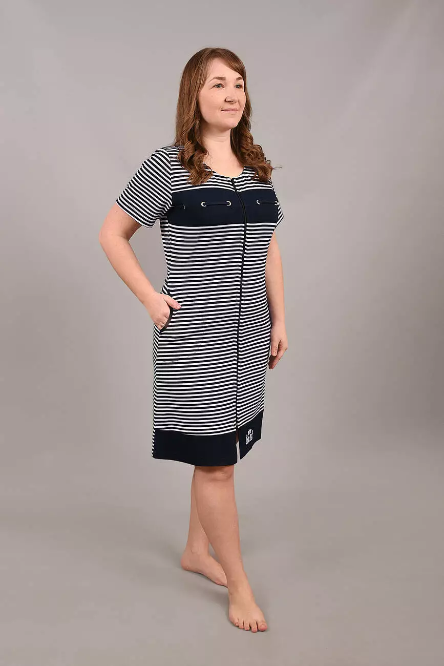 Модель із короткими рукавами, комбінований з кокеткою по груді і практичними бічними кишенями та застібкою на блискавку ідеально підходить для дому. Стильний морський дизайн у смужку додає образу свіжості та елегантності. Відчуйте затишок і якість українського виробника Stass Moda!