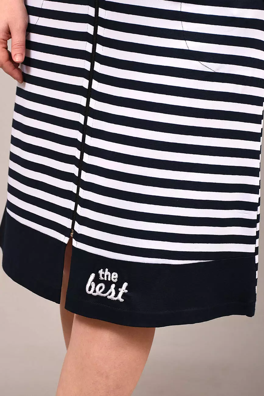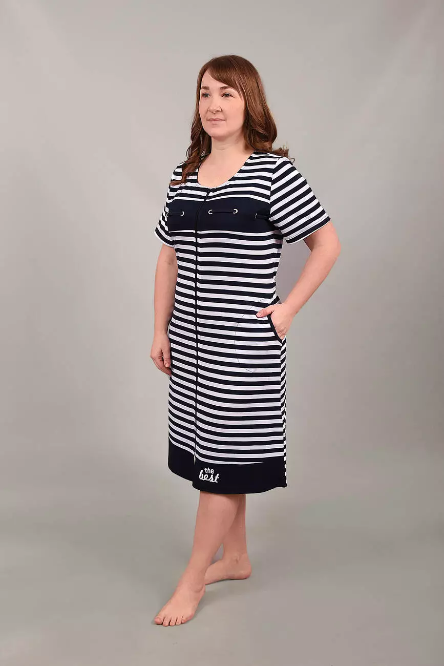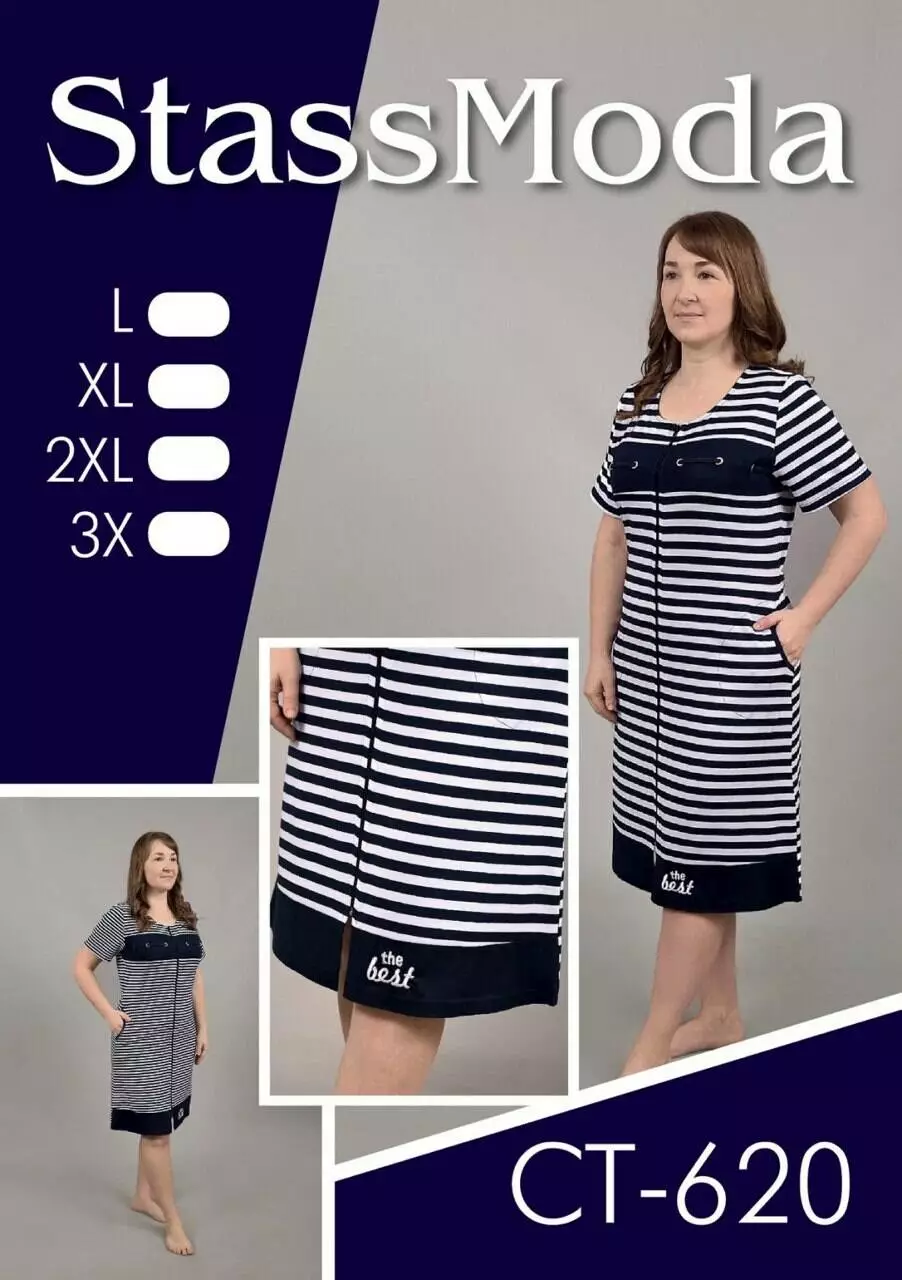 Модель із короткими рукавами, комбінований з кокеткою по груді і практичними бічними кишенями та застібкою на блискавку ідеально підходить для дому. Стильний морський дизайн у смужку додає образу свіжості та елегантності. Відчуйте затишок і якість українського виробника Stass Moda!
