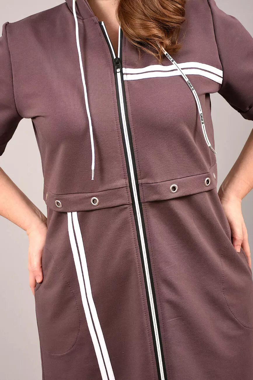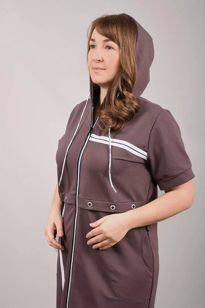 Виготовлений із трикотажного бавовняного велюру. Модель халата з капюшоном та бічними кишенями.