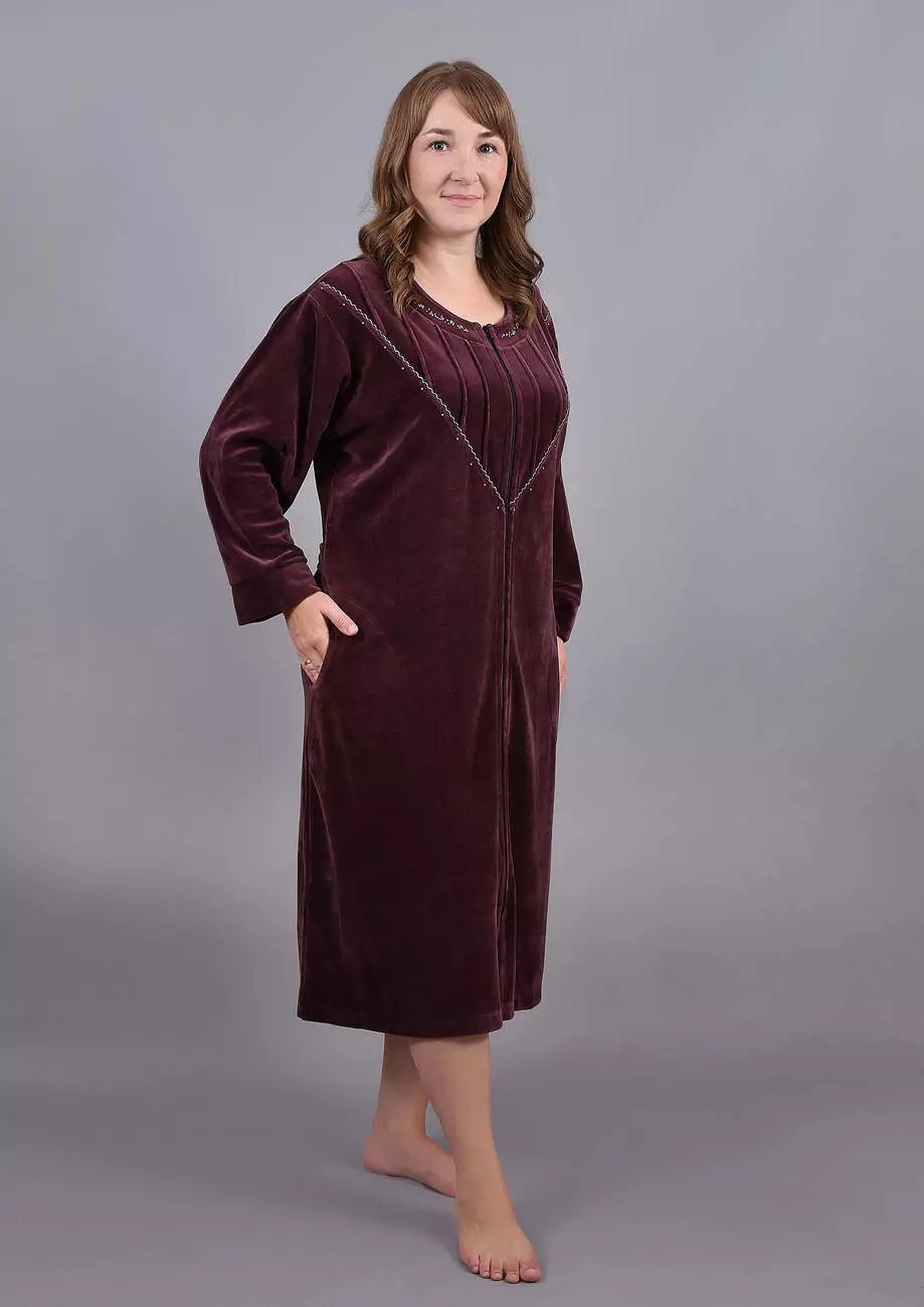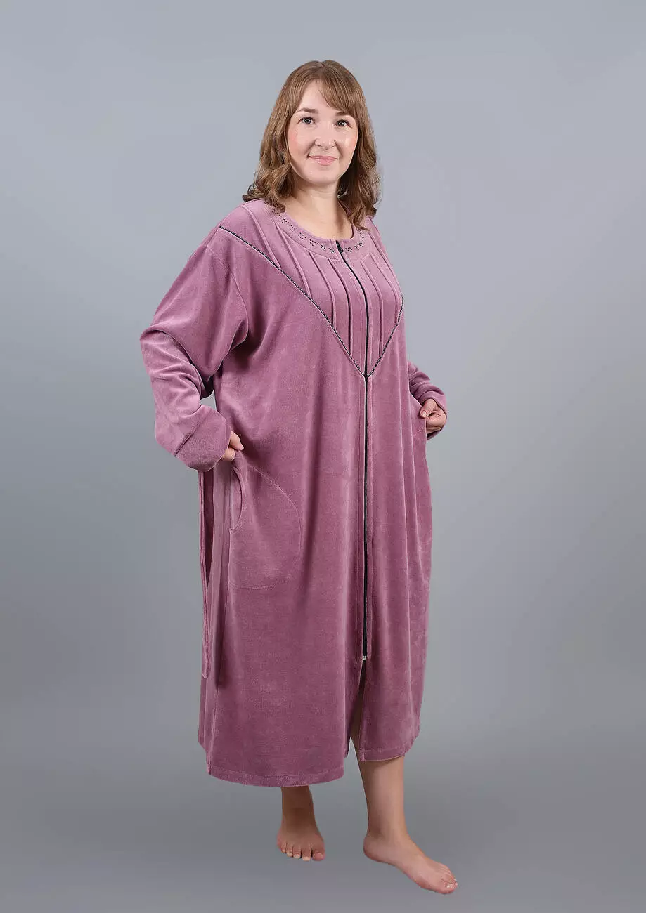 Модель халата однотонна, прикрашена зразами і бічними кишенями. Халат на блискавці з поясом.