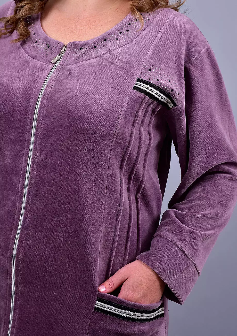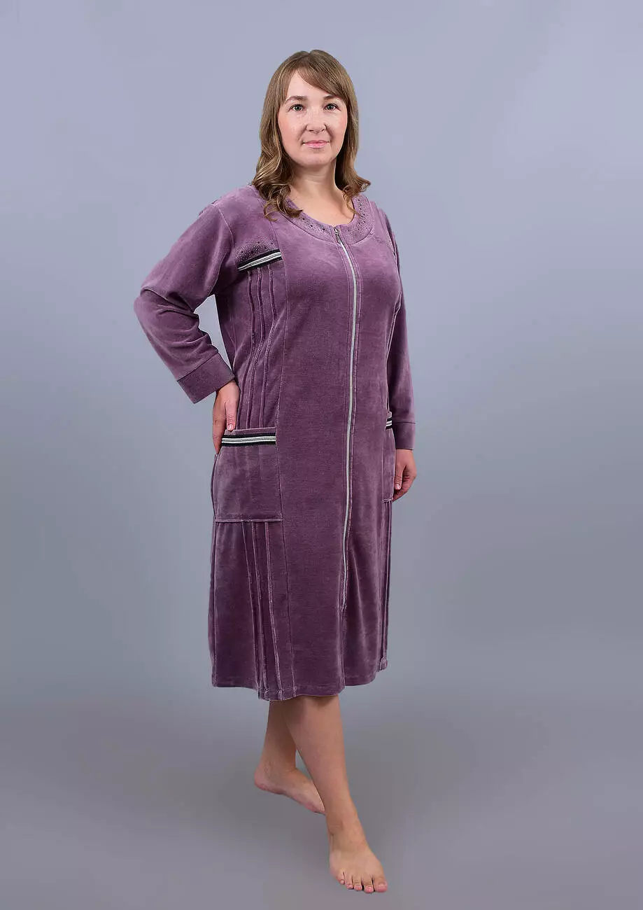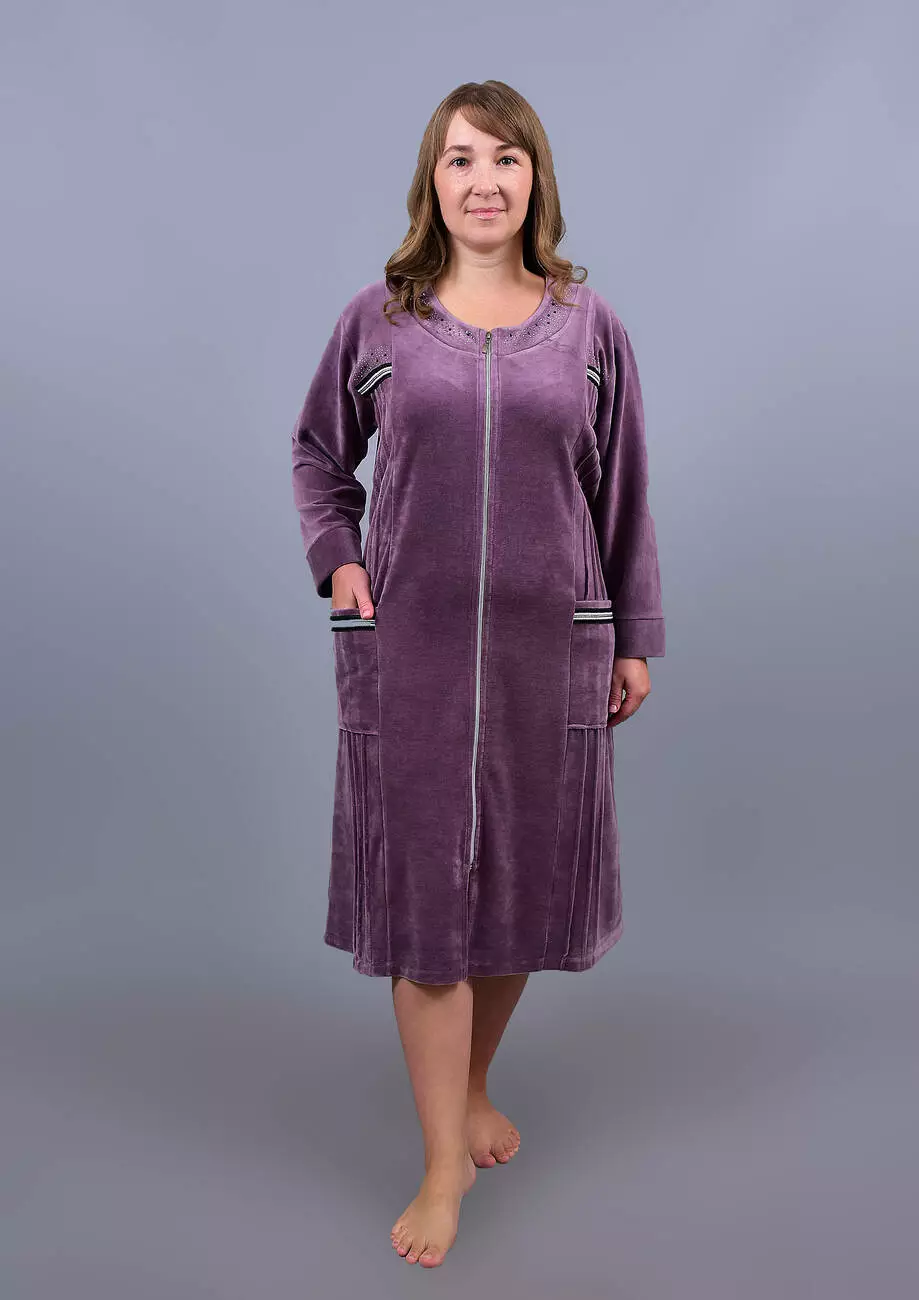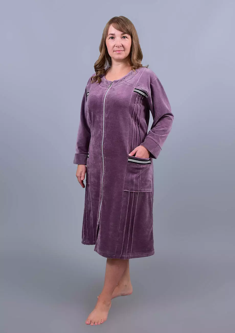 Виготовлений із трикотажного бавовняного велюру. Модель халата з довгими рукавами, защипами по бочках та накладними кишенями.